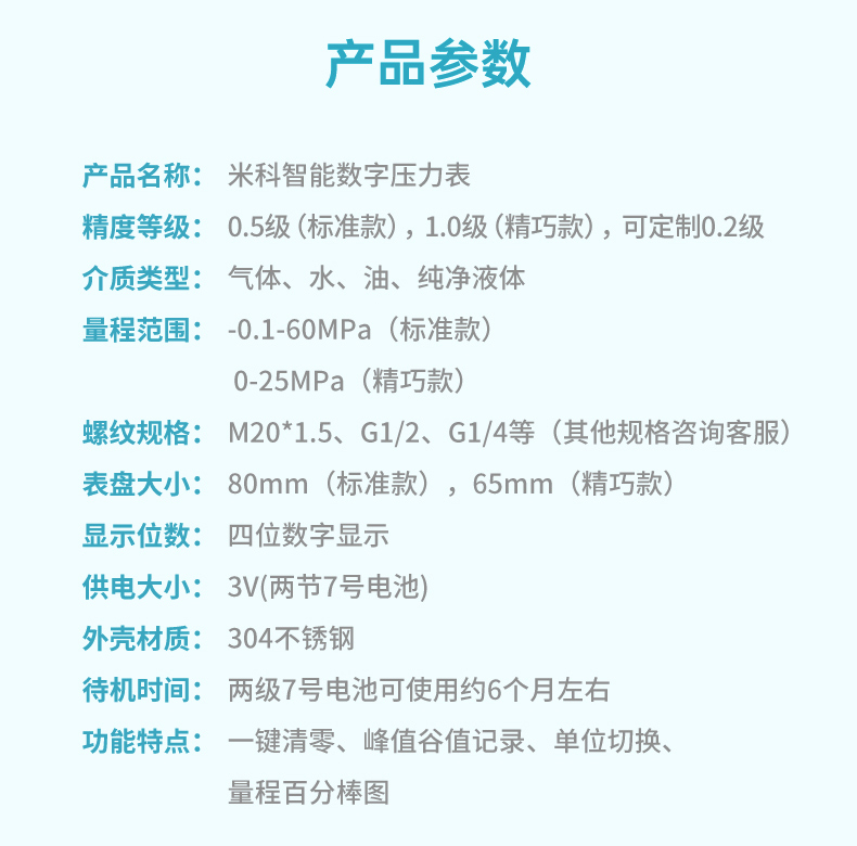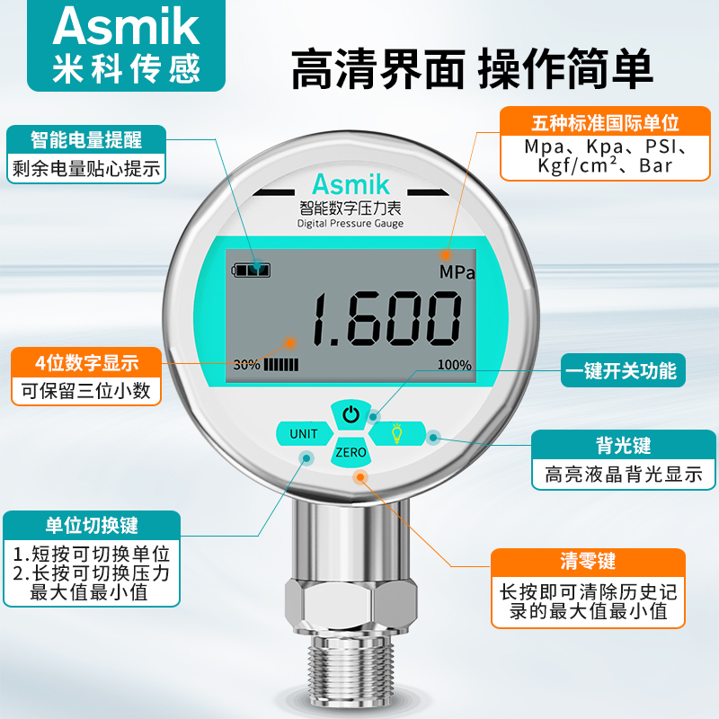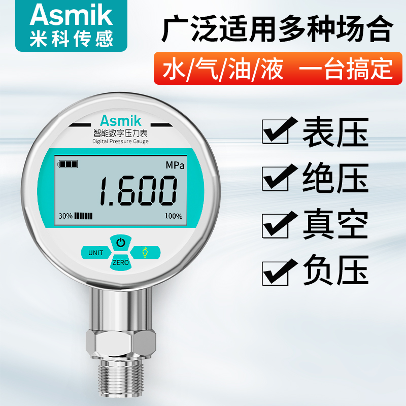 適用場合:米科MIK-Y290/MIK-Y190智能數顯壓力表可測水壓、液壓、氣壓、油壓等,廣泛應用于石油、化工、冶金、輕紡、造紙、環保、食品等領域的壓力測量。咨詢熱線:400-163-1718