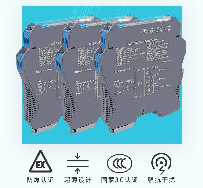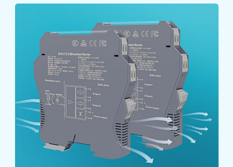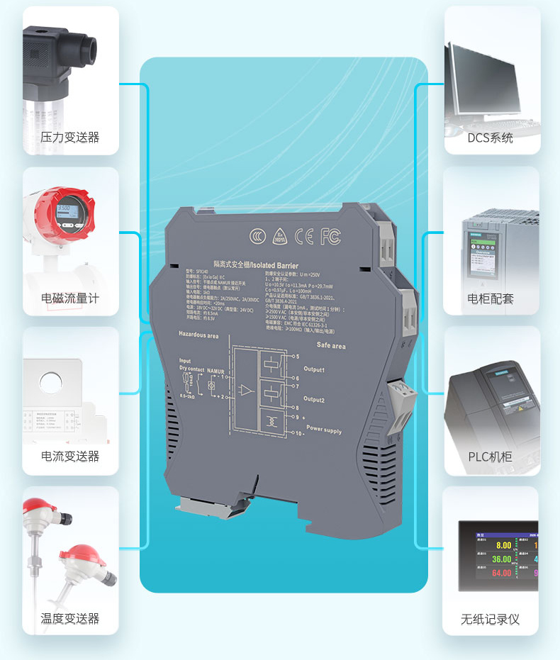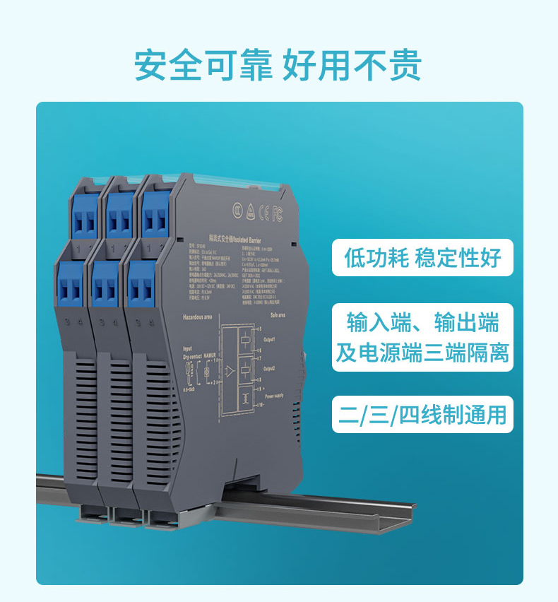 適用場合:本產品將來自危險區的開關量(干接點或接近開關)信號,經隔離轉換為繼電器觸點信號輸出到安全區。可通過撥碼開關設置輸入輸出正反相功能、第二路輸出功能(作為繼電器觸點輸出或作為故障信號輸出)及輸入線路監測功能。輸入端、輸出端及電源端三端隔離。本產品為模擬化設計,具有可靠性高、響應快等諸多優點。可與各類儀表及 DCS、PLC 配套使用。