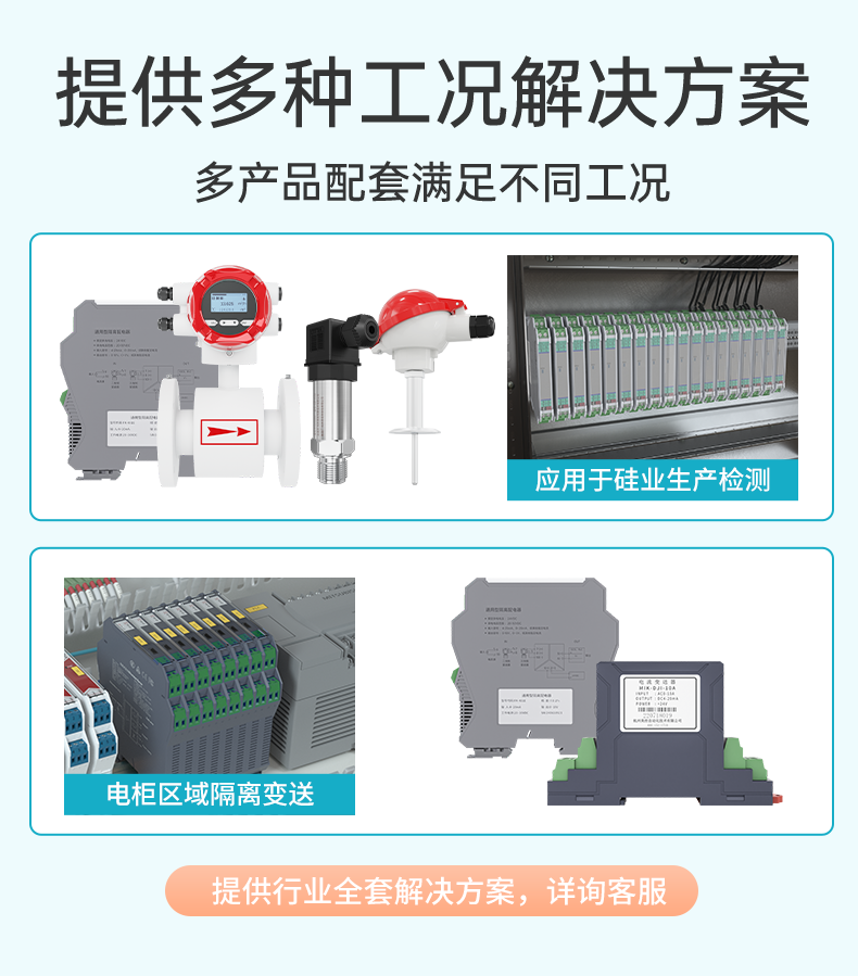 適用場合:隔離器給二、三線制變送器提供隔離的工作電源,將變送器產生的電流信號隔離并轉化為其他儀表所需的信號,實現輸入、輸出、電源之間的三端隔離,從而提高工業過程自動控制系統的抗干擾能力,保證系統的穩定性和可靠性。隔離器可與各類儀表、DCS、PLC 等設備配套使用,在石油、石化、制造、電力、冶金等行業的重大工程中有著廣泛應用。