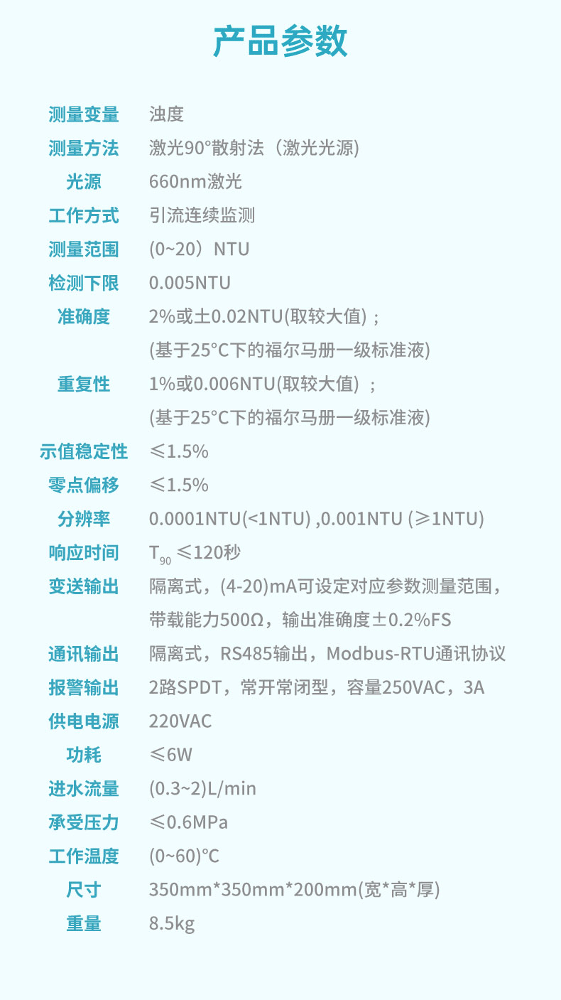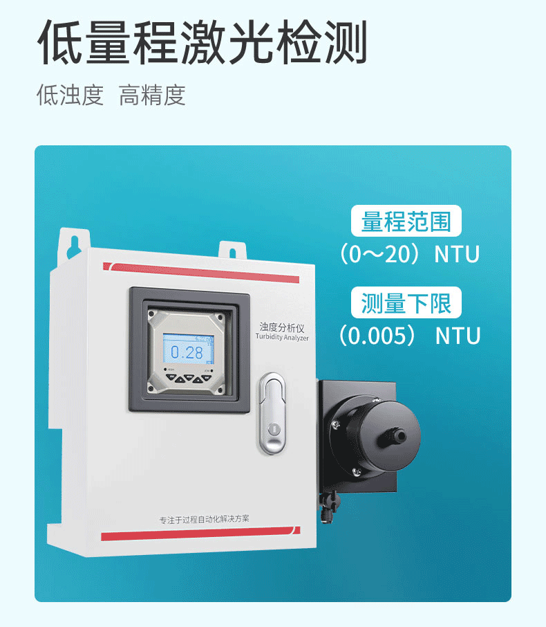 適用場合:本款濁度在線分析儀是針對飲用水水質(zhì)在線監(jiān)測,量身研發(fā)的的產(chǎn)品,具有超低濁度檢出限、高精度測量、設(shè)備長時間免維護、省水工作和數(shù)字化輸出的特點,支持云平臺和手機移動端數(shù)據(jù)遠程監(jiān)控,以及RS485-Modbus 通訊,可廣泛應(yīng)用于自來水出廠水、二次供水、管網(wǎng)末梢水、直飲水、膜過濾水、游泳池、地表水等濁度在線監(jiān)測。咨詢熱線:400-163-1718