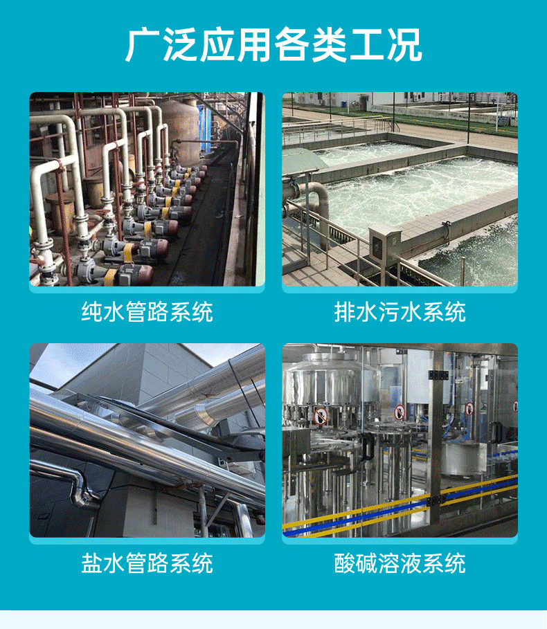 適用場合:污水排水系統、酸堿溶液系統、純色管路系統的流體控制。