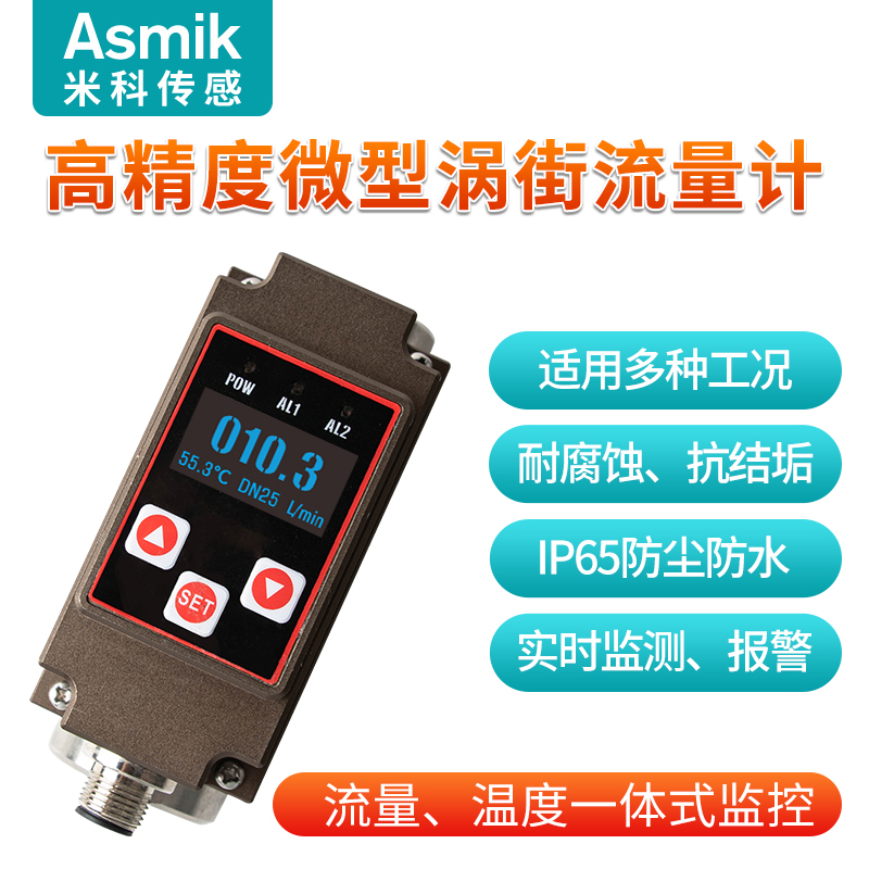 微型渦街流量計結(jié)構(gòu)簡單、精確度高、安裝維修使用方便,可對管道中的液體流量及溫度情況進行實時監(jiān)控,支持流量和溫度(4~20)mA 信號或 485 通信、報警開關(guān)輸出,并采用 OLED 實時顯示流體流量及溫度,實現(xiàn)管道當(dāng)中流量溫度一體式的監(jiān)控功能。本產(chǎn)品廣泛應(yīng)用于石油化工、電力、治金、鋼廠、造紙、食口品加工、水處理、電池廠等行業(yè)。