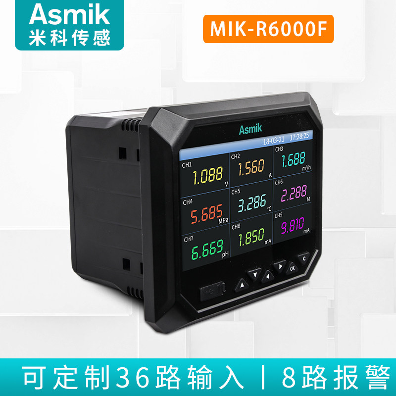 米科MIK-R6000F新款無紙記錄儀是將工業(yè)現(xiàn)場(chǎng)的各種需要監(jiān)視記錄的輸入信號(hào),比如熱電阻和熱電偶的溫度信號(hào)、流量計(jì)的流量信號(hào)、壓力變送器的壓力信號(hào)等。通過高性能微處理器進(jìn)行數(shù)據(jù)處理,一方面在高分辨液晶顯示屏幕上以多種形式的畫面顯示出來,另一方面把這些監(jiān)察信號(hào)的數(shù)據(jù)存放在儀表內(nèi)部的大容量存儲(chǔ)芯片內(nèi),以便在儀表上直接進(jìn)行數(shù)據(jù)和圖形查詢、翻閱和打印。