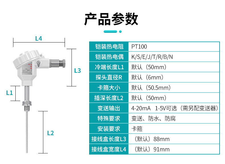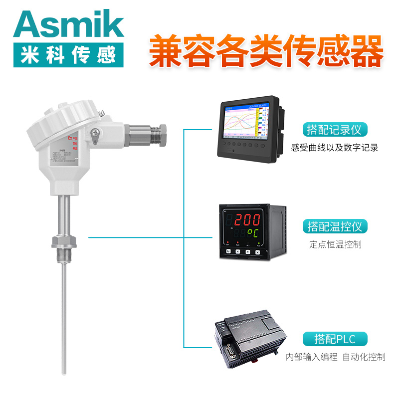 適用場合:米科隔爆鎧裝溫度傳感器可以直接測量各種生產過程中液體,蒸汽和氣體介質以及固體表面的溫度,通常和顯示儀表、記錄儀表等配套使用。